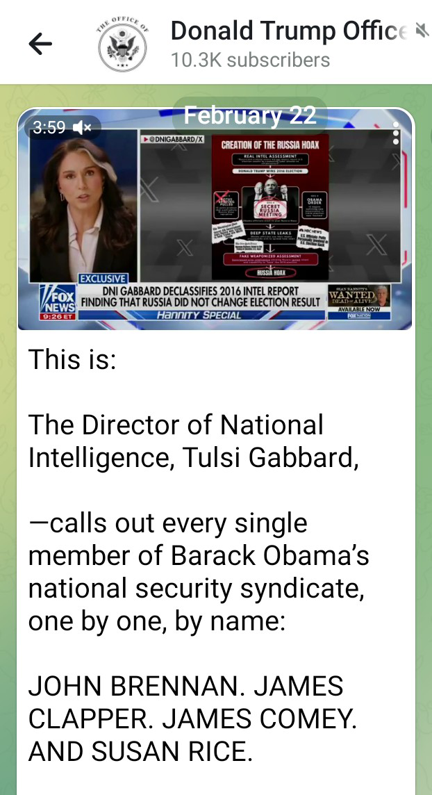 Barack Obama and his team’s goal was essentially to not accept the decision of the American people and to use this manufactured, politicized intelligence as a means to enact what would become, essentially, a years’-long coup against President Trump. You have gone into great detail over these years about the effects this document and this decision have had.” https://t.me/c/1799212859/3584