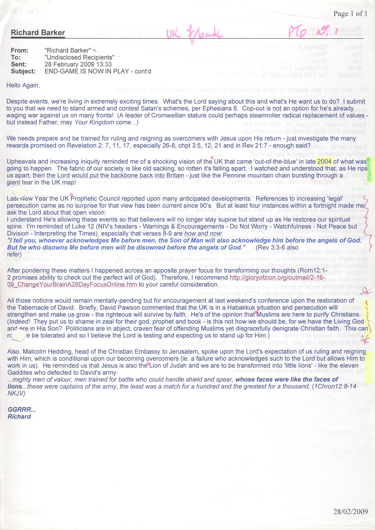 A strong disagreement between two international leaders about the relevance of a scripture to accountability of a controversial evangelist – both of whom Nina and I knew personally through our prayer ministry training and through the Lord enabling her to walk again (see From ‘Disabled’ to Enabled) – led to an awesome personal revelation that prompted me months later to start emailing some friends and church leaders on End-times.