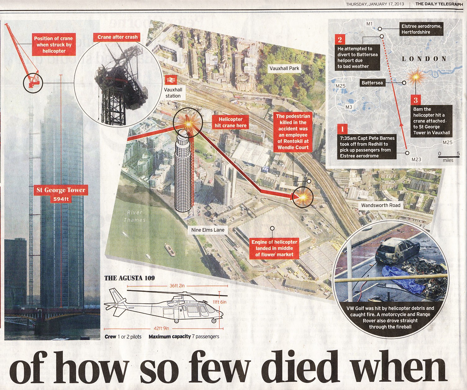 Regrettably, Peter Barnes and Matthew Wood were the only ones to have lost their lives when Pete’s helicopter inexplicably went out of control and crashed into the crane and ‘friendly giant’ Matthew was the unfortunate passing pedestrian down below. [See Daily Mail’s online account and photo library.]