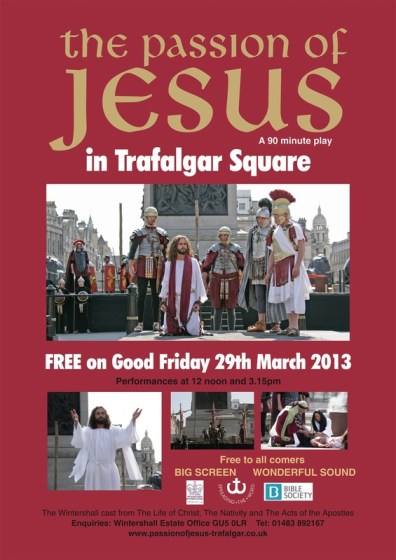 After last year’s successful Passion performed by the Wintershall Players to a packed audience of thousands in Trafalgar Square, they have again been given permission to perform this inspirational play on Good Friday 29th March 2013 at 12 Noon and again at 3.15 p.m.