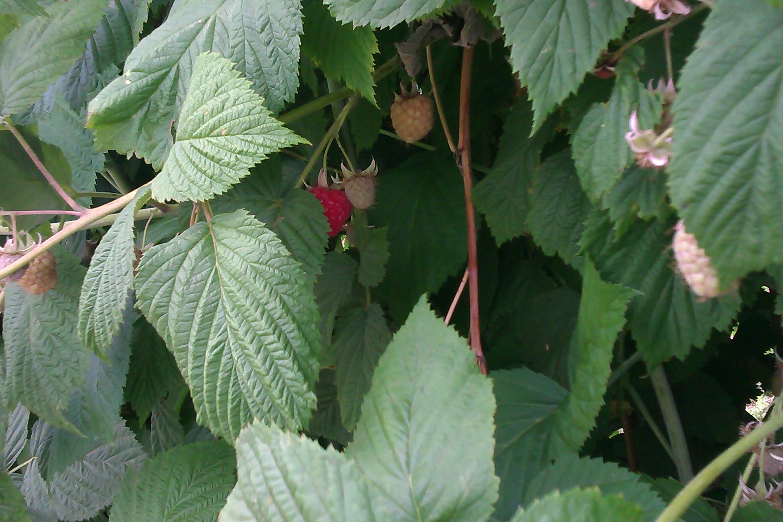 Ripening raspberries around the top and sides of the long rows of bushes need only a slight squeeze and tug off their stalks. Ripe ones come off very easily. Now, I always look within the bushes and at a lower level to search out any hidden from view under all the broad leaves.