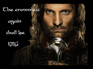 AragornIn my story the Kingdom, I have imagined the King to be like Aragorn in the Lord of the Rings.  Aragorn is a King but to the Hobbits he is a ranger called Strider, their guide and protector.  If you watched the Return of the King, you saw Strider become who he was born to be; the King of Gondor.