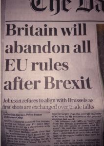 ‘Boris Johnson insisted that Britain would not follow any EU rules after Brexit as he set up a showdown with Brussels over a trade deal. The Prime Minister made clear that he would pursue a hard Brexit by saying there would be “no alignment” between the two sides, defying the EU’s claim that it was a “must” for any future relationship. On a historic day for Britain’s relationship with the rest of Europe, the Brexit “divorce” Bill sailed through the Commons with a majority of 124 on Friday, and will become law on Jan 9, enabling a Jan 31 exit and for trade negotiations to begin in earnest. It brought an end to three and a half years of indecision in Parliament, and “means we are one step closer to getting Brexit done”, Mr Johnson said.’ (The Telegraph)