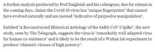 Note in particular: …A further analysis produced by Prof Dalgleish and his colleagues … claims the Covid-19 virus has “unique fingerprints” that cannot have evolved naturally and are instead “indicative of purposive manipulation“… the new study, seen by The Telegraph, suggests the virus is “remarkably well-adapted virus for human co-existence” and is likely to be the result of a Wuhan lab experiment to produce “chimeric viruses of high potency“.