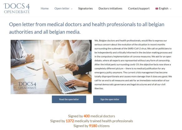 ‘We, Belgian doctors and health professionals, wish to express our serious concern about the evolution of the situation in the recent months surrounding the outbreak of the SARS-CoV-2 virus. We call on politicians to be independently and critically informed in the decision-making process and in the compulsory implementation of corona-measures. We ask for an open debate, where all experts are represented without any form of censorship. After the initial panic surrounding covid-19, the objective facts now show a completely different picture – there is no medical justification for any emergency policy anymore. The current crisis management has become totally disproportionate and causes more damage than it does any good. We call for an end to all measures and ask for an immediate restoration of our normal democratic governance and legal structures and of all our civil liberties.’