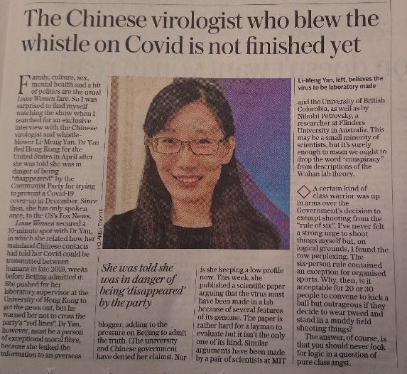 Guess who’s photo was smiling at me upon opening today’s Daily Telegraph whilst I bit into a ham-and-cheese croissant? After the front-page cartoon, I next go to Readers’ Letters (alongside the centre-page editorial) but found a different-style centre-spread and was astonished to recognise, close by its footer, someone I’d again blogged about only on Thursday (as did Jonathan Ely here) – Chinese virologist Dr Li-Meng Yan: