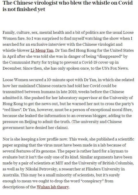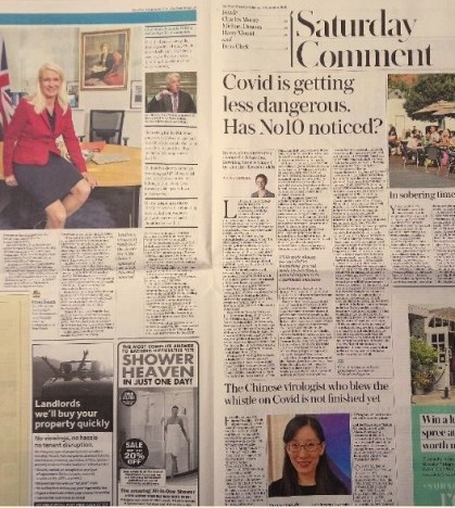 Guess who’s photo was smiling at me upon opening today’s Daily Telegraph whilst I bit into a ham-and-cheese croissant? After the front-page cartoon, I next go to Readers’ Letters (alongside the centre-page editorial) but found a different-style centre-spread and was astonished to recognise, close by its footer, someone I’d again blogged about only on Thursday (as did Jonathan Ely here) – Chinese virologist Dr Li-Meng Yan: