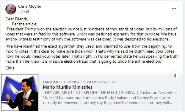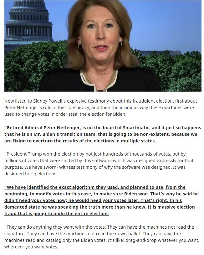 “The evidence I’m compiling is overwhelming that this software tool was used to shift millions of votes from President Trump and other Republican candidates to Biden and other Democrat candidates. We are proceeding to prepare our lawsuit and plan to file it this week. It will be epic...”