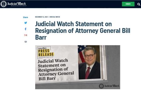(Dec 14, Washington, DC) – ‘Judicial Watch President Tom Fitton made the following statement in response to the resignation of Attorney General William Bar: