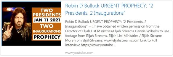 ‘Robin then relates to Kim’s prophecy re 2 Presidents. When he heard it he heard the Lord say “TWO Presidents; TWO Inaugurations”. He’s waiting to see how God fulfills that.