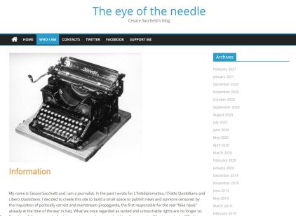 “…In the past I wrote for L’Antidiplomatico, Il Fatto Quotidiano and Libero Quotidiano. I decided to create this site to build a small space to publish news and opinions censored by the inquisition of politically correct and mainstream propaganda, the first responsible for the real “fake news” already at the time of the war in Iraq. What we once regarded as vested and untouchable rights are no longer so. Freedom of the press and of opinion are in grave danger and within a few years it will be increasingly difficult to share news and facts that the orthodox media consider inconvenient to the strong powers. The confirmation of this comes from the fact that anyone who dares to deviate from the dominant media line in favor of the globalist and immigrationist (sic) ideology, it is automatically identified as an expression of Kremlin propaganda, and therefore no longer worthy of having an opinion that is not the only one accepted by the current regime. For me, journalism means respecting readers and putting in front of them the news and facts that they have a right to know. A Ministry of Truth that decides what is right or wrong for readers is something that can only exist in a totalitarian regime. This blog does not want to be that, but a space where readers are free to form their own opinion without someone deciding for them.”