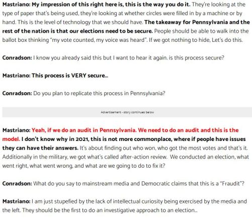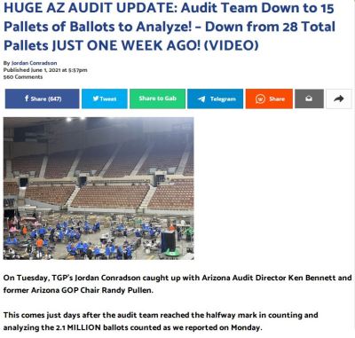 “Meanwhile, the Pennsylvania legislature delegation is meeting with the Arizona legislature members to discuss the integrity of the election. Pennsylvania is the state where there was the biggest theft against Trump.However, nothing can stop the mechanism that was set in motion. Maricopa was the first Domino. All the other states where the fraud was perpetrated are coming now. The electoral coup against Donald Trump is falling apart day after day.”