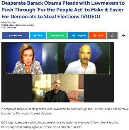 ‘A desperate Barack Obama pleaded with lawmakers to push through the ‘For the People Act’ to make it easier for Democrats to steal elections. GOP legislatures are working to secure elections by implementing voter ID laws, banning ballot harvesting and requiring signature checks on all absentee ballots.