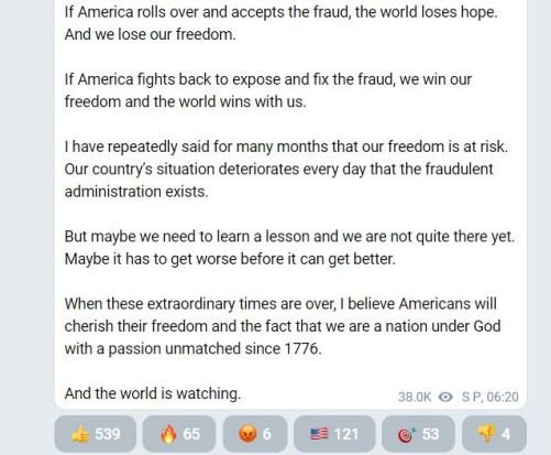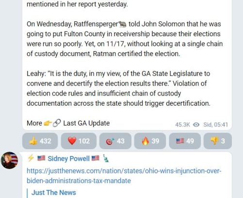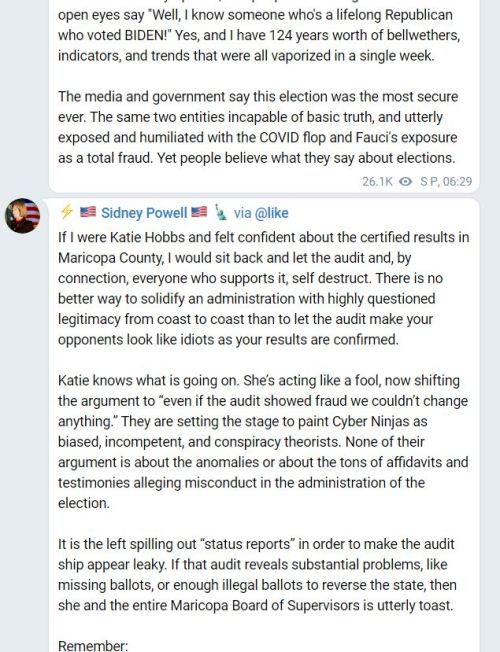Attorney Sidney Powell on news of US election audits Posted on Saturday, 3 July, 2021 by Richard Barker For readers’ information here’s the latest comments from Sidney Powell on progress of investigations and audits in ‘battle-ground’ states of November’s presidential election: Click image for link to her channel Share this: Click to share on Facebook (Opens in new window) Facebook Click to share on WhatsApp (Opens in new window) WhatsApp Click to share on LinkedIn (Opens in new window) LinkedIn Click to share on X (Opens in new window) X More Click to print (Opens in new window) Print Click to share on Pinterest (Opens in new window) Pinterest Click to email a link to a friend (Opens in new window) Email Click to share on Tumblr (Opens in new window) Tumblr Click to share on Telegram (Opens in new window) Telegram Click to share on Pocket (Opens in new window) Pocket Click to share on Reddit (Opens in new window) Reddit Like Loading...