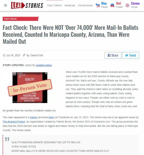 Lead Stories’ explanation in denying the auditors’ in-depth, triple-recount investigation is, therefore, rather convoluted. It’s an attempt to explain why the numbers are not what they appear and as someone wrote, it’s like saying 2+9+11-16 = 4. (The writer used an even more protracted equation.)