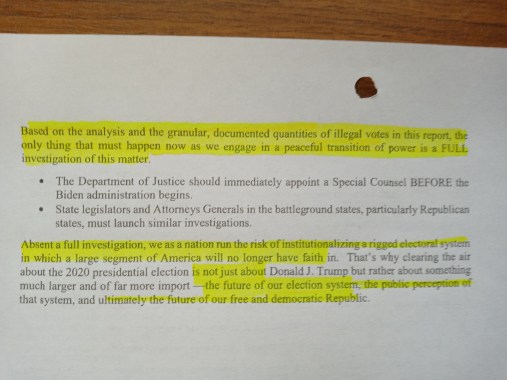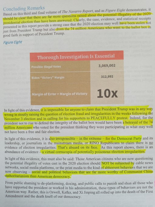 “In the light of this evidence, it is impossible for anyone to claim that President Trump was in any way wrong in stoutly raising the question of election fraud and irregularities in the weeks following the November 3 election and in calling for his (74 million) supporters to PEACEFULLY protest.”