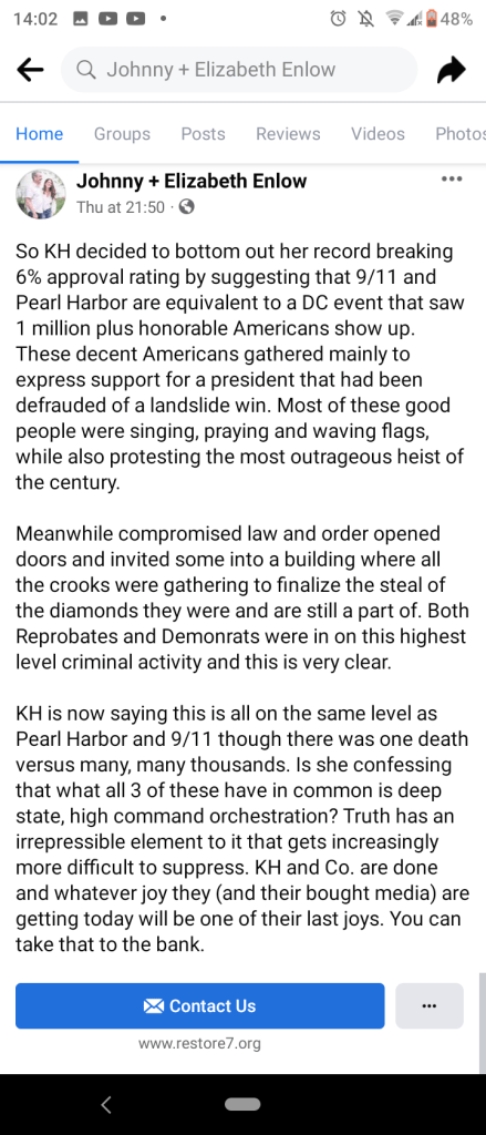 Note Johnny Enlow on her idiotic remarks comparing the Twin Towers attack with last January’s protest outside the US Capitol: