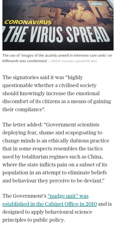 The letter’s 40 professional signatories – led by Dr G.ary Sidley, a retired clinical psychologist – said they opposed the use of dramatic adverts, which included slogans such as: “If you go out you can spread it, people will die.” Read in full here.