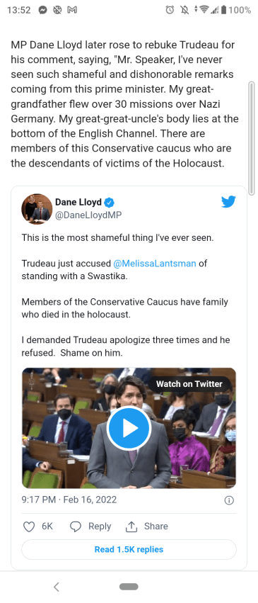 That description is apposite for the outrage Trudeau caused the next day, Wednesday, in Parliament with his exceptionally offensive insult to one of the opposition party. Three times he was asked to apologise but refused and walked away – https://www.foxnews.com/world/canada-house-commons-erupts-after-trudeau-accuses-first-jewish-woman-mp-supporting-swastikas: