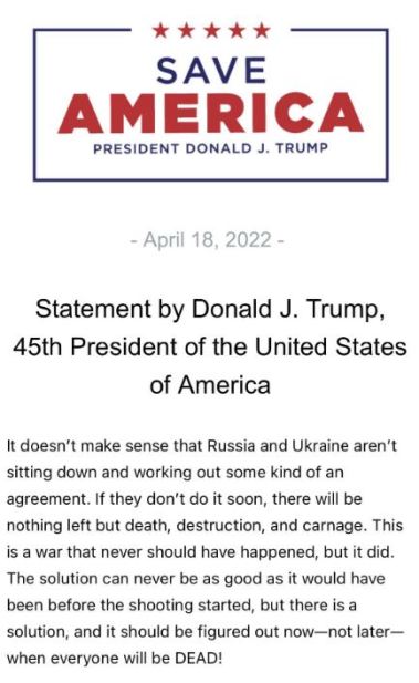 President Trump weighed in yesterday on the Biden-British carnage which is Ukraine. He, unlike the lunatic Washington D.C. Republican establishment (including those claiming to be allied with him and to represent MAGA) said that every effort must be made to establish the peace—every effort now, and urgently. The poisonous mainstream media is poisonously parsing his text (New York Magazine somehow found his plain meaning similar to Charlottesville) or blacking it out, (Fox, OANN), or relegating it to an also ran (Newsmax)….