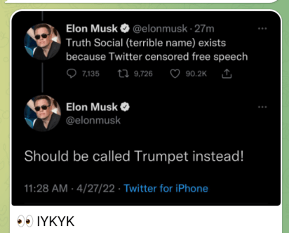 Lastly, but not finally, NOTE POTUS 45’s statement posted 4 May that highlighting the difference between his social media platform and the revamped Twitter platform: