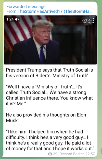 A couple more screenshots of 7th May on Telegram’s Richard’s Watch (where I cover more specific news and commentaries) of Trump and Republicans’ elections and then to his Truth Social on Telegram, where we get an unusual, very encouraging item on Bible prophecy, which will feature in the next post: