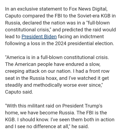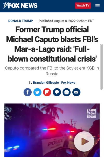 FBI’s raid on Trump’s home “a full-blown constitutional crisis” Posted on Wednesday, 10 August, 2022 by Richard Barker Continue reading at https://www.foxnews.com/politics/former-trump-official-michael-caputo-fbi-mar-a-lago-raid-constitutional-crisis Share this: Click to share on Facebook (Opens in new window) Facebook Click to share on WhatsApp (Opens in new window) WhatsApp Click to share on LinkedIn (Opens in new window) LinkedIn Click to share on X (Opens in new window) X More Click to print (Opens in new window) Print Click to share on Pinterest (Opens in new window) Pinterest Click to email a link to a friend (Opens in new window) Email Click to share on Tumblr (Opens in new window) Tumblr Click to share on Telegram (Opens in new window) Telegram Click to share on Pocket (Opens in new window) Pocket Click to share on Reddit (Opens in new window) Reddit Like Loading...