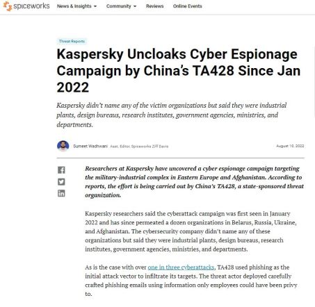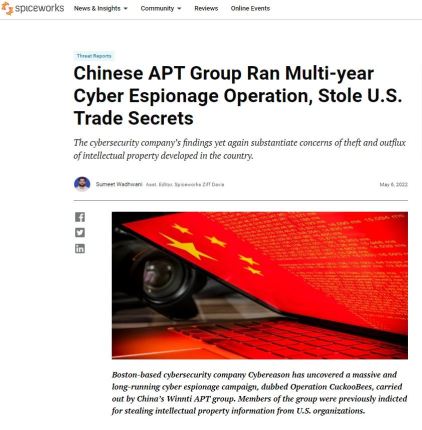 A US firm uncovers Chinese espionage campaign: “OperationCuckooBees”.