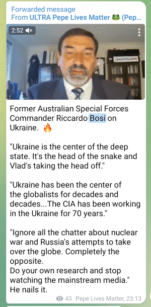 Furthermore, on 17 March I copied this item onto this blog’s Telegram – click thereupon to listen to 3 minutes video to learn from an authoritative source what’s really going on – Commander Bosi confirms the principal thrust of the other items I re-published.