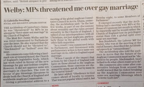 I’m very pleased to read that Archbishop of Canterbury Justin Welby reports telling MPs who threatened him to introduce supposedly ‘equal marriage; in England: