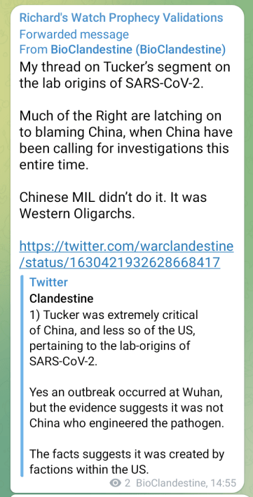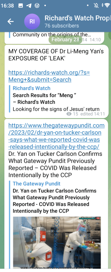 Prophecy Progress Update 43 – laboratory leak of “Man-made” virus Posted on Tuesday, 28 February, 2023 by Richard Barker Background: Covid-19 Bio-weapon Click here for more links validating the word I received that CV-19 is “Man-made”. Click here for GPT’s advert-free printer friendly version of the above. Share this: Click to share on Facebook (Opens in new window) Facebook Click to share on WhatsApp (Opens in new window) WhatsApp Click to share on LinkedIn (Opens in new window) LinkedIn Click to share on X (Opens in new window) X More Click to print (Opens in new window) Print Click to share on Pinterest (Opens in new window) Pinterest Click to email a link to a friend (Opens in new window) Email Click to share on Tumblr (Opens in new window) Tumblr Click to share on Telegram (Opens in new window) Telegram Click to share on Pocket (Opens in new window) Pocket Click to share on Reddit (Opens in new window) Reddit Like Loading...