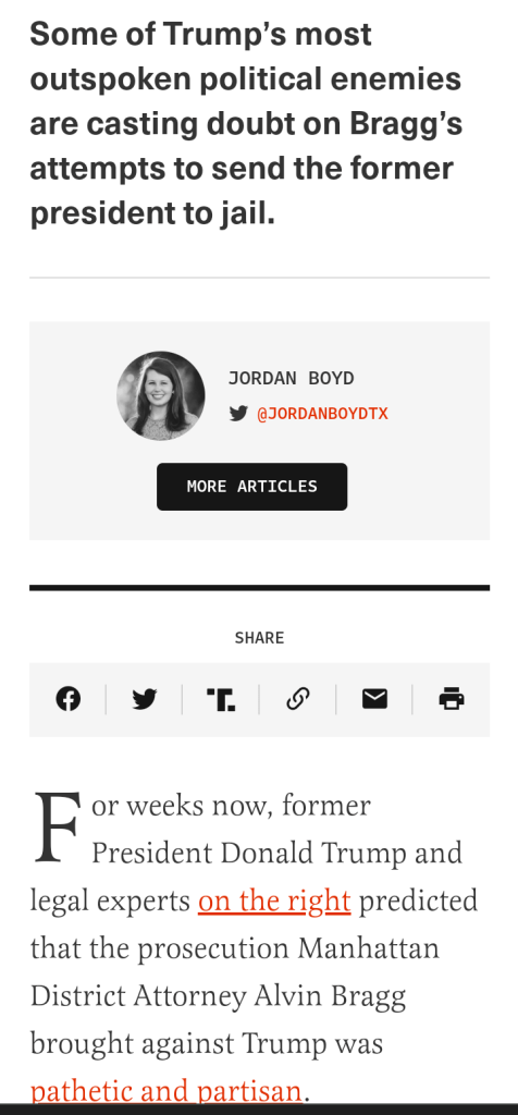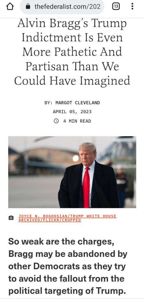 …Alvin Bragg, acting as the Biden DOJ’s cat’s-paw, sanctimoniously declared that Trump somehow misled the 2016 voting public through the 2017 bookkeeping entries the indictment alleges while Joe Biden’s supporters in Silicon Valley and the intelligence community used all the powers of the state and millions of dollars to suppress the Hunter Biden laptop story in 2020. They too, have been excused…
