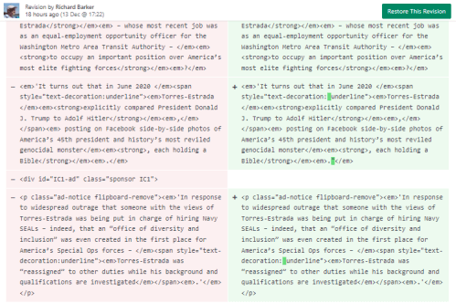Can it be found?? Thankfully, WordPress saves and enables editorial access to 25 drafts of each post, AND its editorial desktop has windows onto not only normal ‘visual’ content but also to ‘Text’ that includes coding of a post’s formatting. In scrolling through revisions, as shown below, I could read all coding that gets inserted when coping from other sources. (Facebook is full of ‘div’ codes making its content a continuous read.)