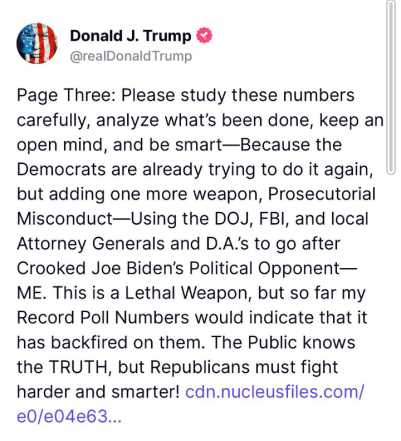 NOW, after separating President Trump’s progress from the malicious persecution and prosecutions of the Biden regime, note his following statement.
