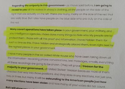I have many people in the so-called White House who have been taking down all the information- recording phone conversations, text messages, emails, everything. All these recordings are going to be shown. (They will prove) treason for the majority in your government, oh United States- treason because most of them cheated their way into those positions. And they stole many elections, not just one, two, or three, but many. It will be astounding to the American people just how many elections have been stolen and how many of your votes did not count….”