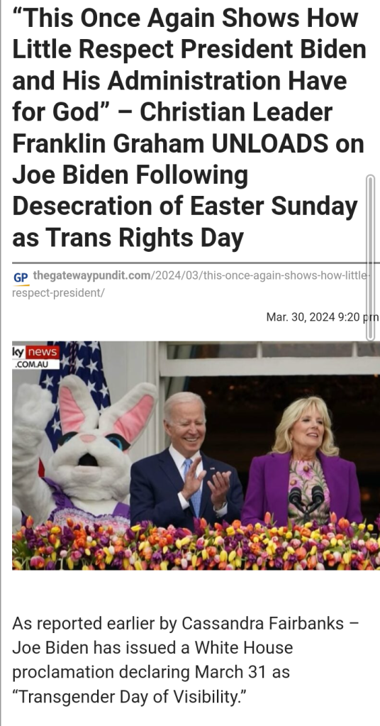 Exposure of rampant deep evil in USA and consequential judgement must now go full throttle after Biden blatantly throws down satan’s gauntlet at The Almighty on the day’s when Christians mourn Jesus’ death and rejoice in His resurrection, on behalf of ALL humanity.  I’m sure most readers will be aware of that nasty news: