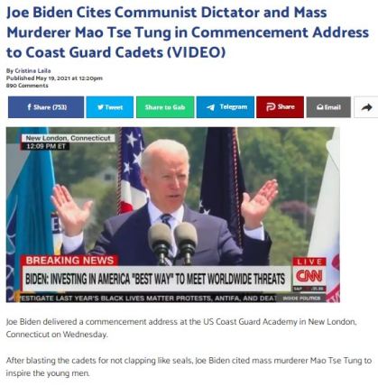 This reads, ‘Joe Biden delivered a commencement address at the US Coast Guard Academy in New London, Connecticut on Wednesday. After blasting the cadets for not clapping like seals, Joe Biden cited mass murderer Mao Tse Tung to inspire the young men. Mao Tse Tung, a Communist dictator, murdered up to 70 to 80 million Chinese last century, according to most accounts.