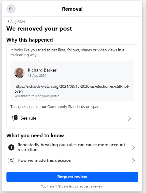FaKeBuK messed up again after I forwarded the previous post on Zuckerberg admitting by implication to election interference by censorship on behalf of Biden’s administration. The item stayed thereon but a couple of folk commented that upon their sharing to their timeline it got removed from both! After having several of my blogs removed perhaps the social media platform is getting confused and messed up!