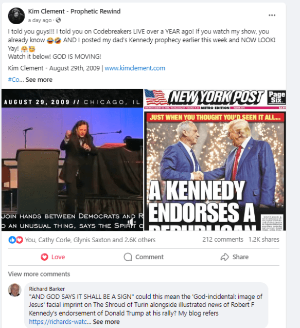 “For what has happened to the Kennedys,says the Spirit of God, was spoken of. Now I will join hands between Democrats and Republicans and do an unusual thing, says the Spirit of God, – come on!” (congregation applause)