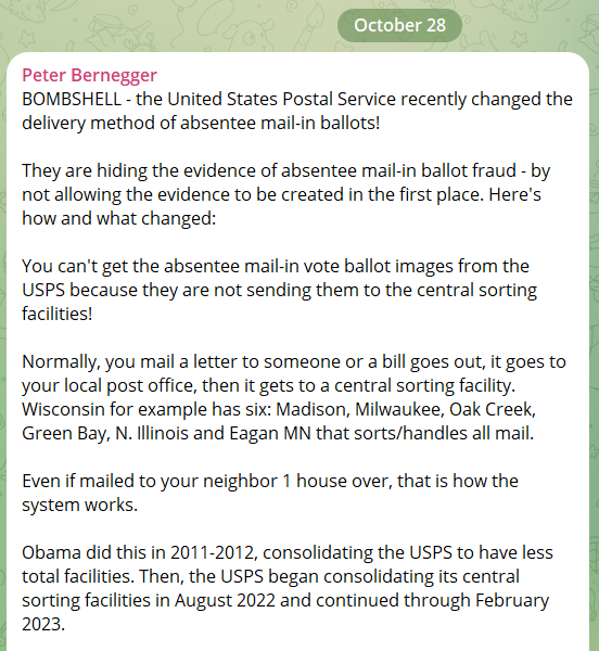 Later, on 21st October he reports election theft has already begun in Pennsylvania and the next day in Boston, and the next day brings this alert