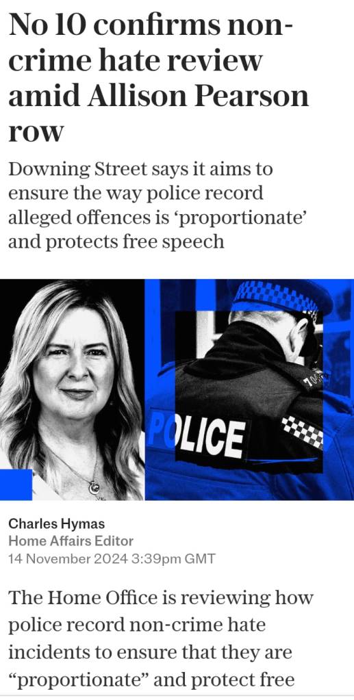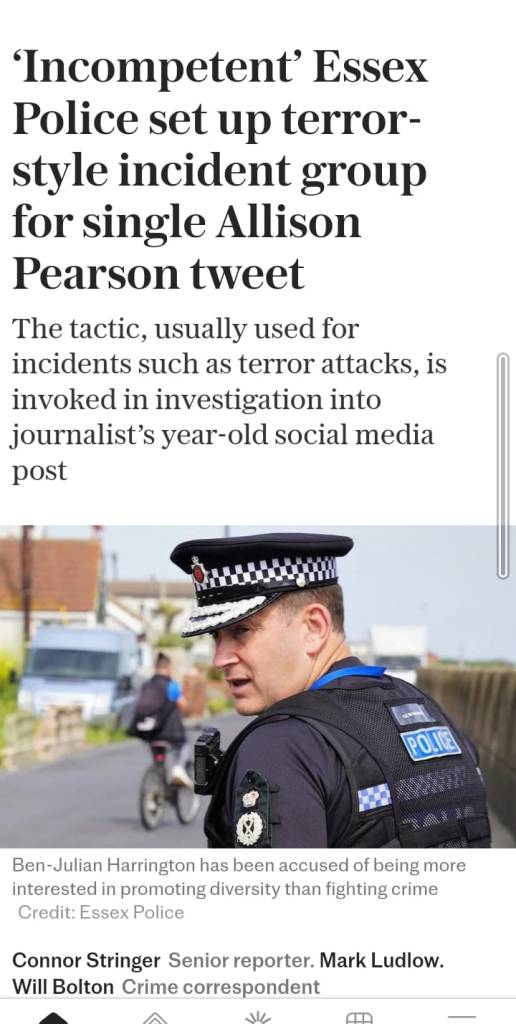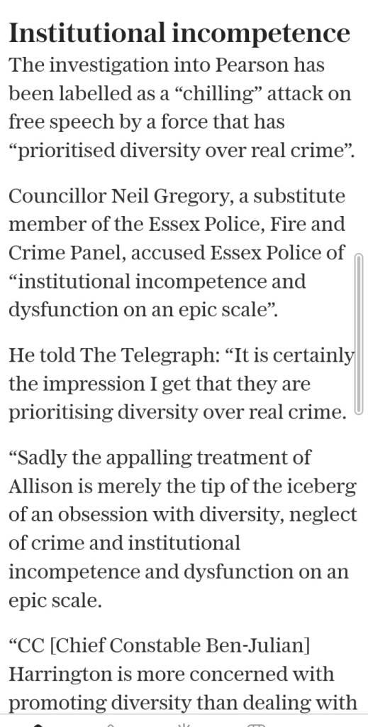 Pearson said she was told on Sunday that it was a non-crime hate incident as well as allegedly inciting racial hatred. Essex Police has accused The Telegraph of presenting “wholly inaccurate information” as fact.’