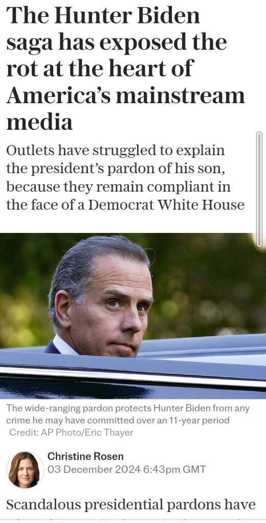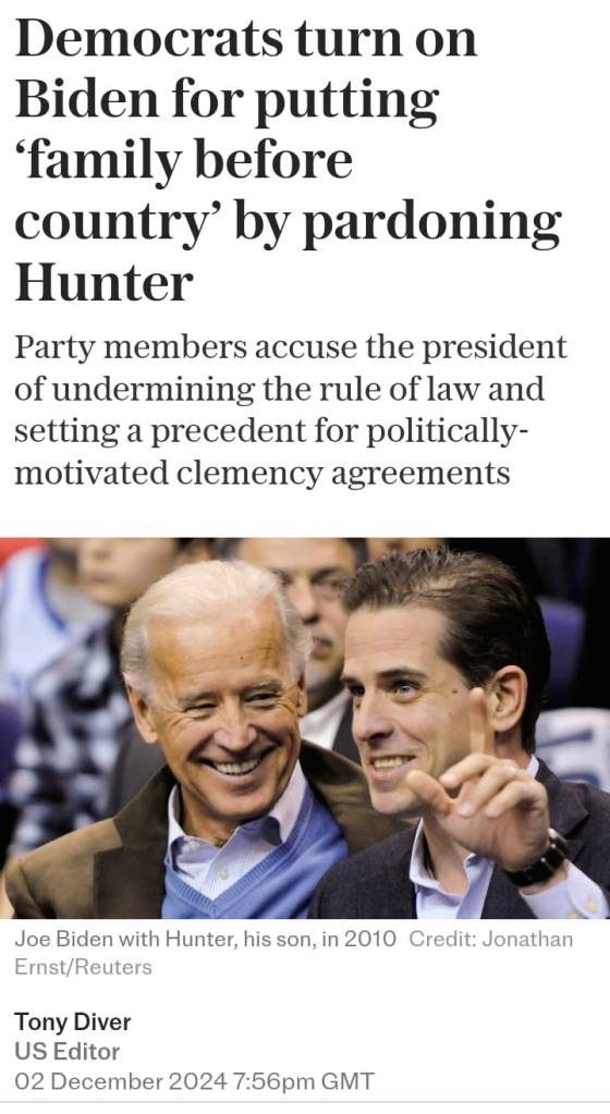 Joe Biden’s pardoning of his son Hunter looks like an admission of guilt and the dates of the immunity look very suspicious of strong links to Ukraine. People should now see how corrupt the whole system is.”