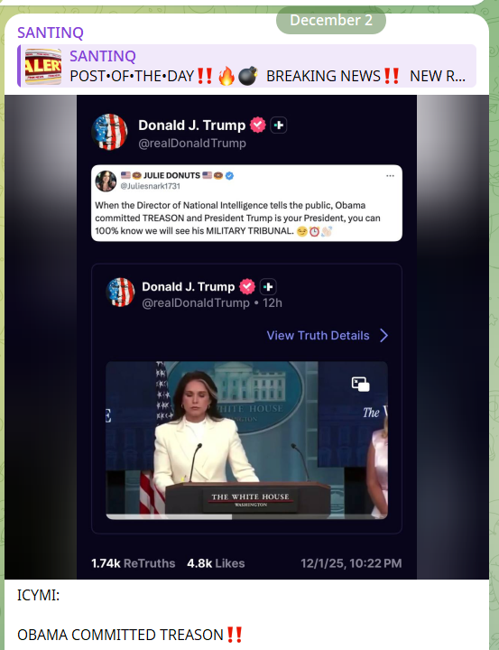 “Washington is nervous because Tulsi has crossed a line that cannot be uncrossed,” he continued. “Once the documents are released, the public will see how much was hidden and how much damage was done. Transparency is the one thing the architects of Russiagate feared the most….”