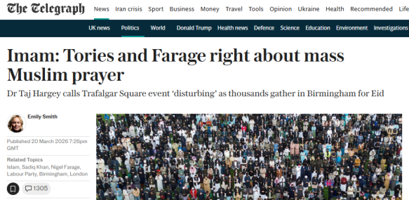Writing for The Telegraph (see below), Dr Taj Hargey said he found the open-air worship on Monday, attended by hundreds of men, including Sir Sadiq Khan, the Mayor of London, “disturbing”.
