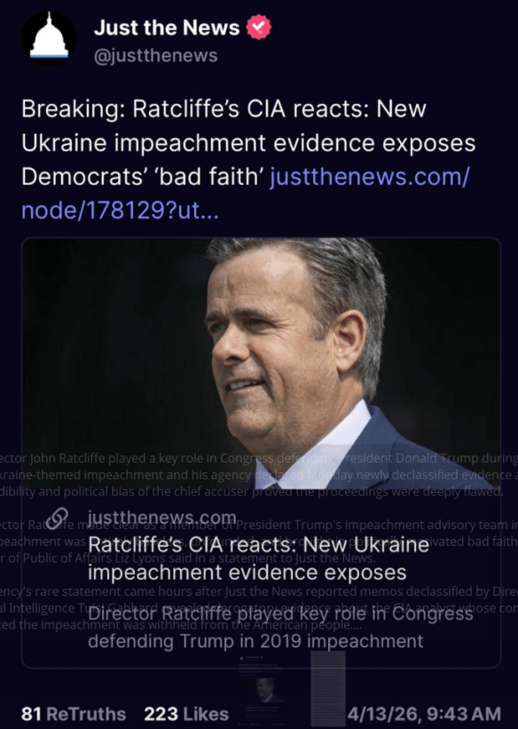 “As Director Ratcliffe made clear as a member of President Trump’s impeachment advisory team in 2019, this impeachment was entirely baseless, unfounded, and brought in politically-motivated bad faith,” CIA Director of Public of Affairs Liz Lyons said in a statement to Just the News.