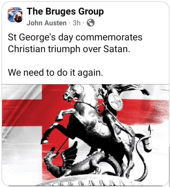 Christian People’s Alliance UK Facebook item notes ‘St George was a 3rd-century Roman soldier born in Cappadocia (modern Turkey) who was martyred around 303 AD for refusing to renounce his Christian faith during Diocletian’s persecution. He was lauded by Kings of England for what he did.’