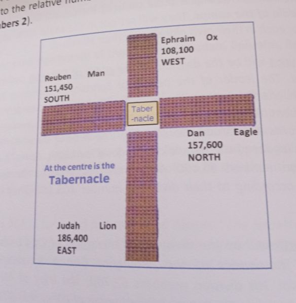 ‘So, the four camps (Judah the Lion, Ephraim the ox, Reuben the man, Dan the eagle) surrounded the Tabernacle (God’s throne room on earth, inthe same way thatthe four creatures (that resemble a lion, an ox, a man and an eagle) surround the actual throne of God in heaven.’