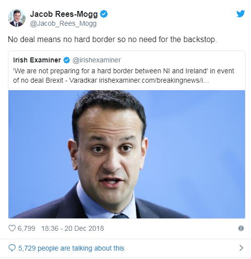 At the close of link 4, I noted that Leo Varadkar, prime minister of the Irish republic, has ruled against setting up a hard border and thus no need for any Brexit ‘backstop’ as part of the EU Withdrawal Agreement. This week he confirmed that’s the case and Jacob Rees-Mogg MP picked up on that declaration: