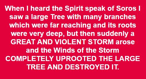 ‘Now In looking a little closer at who Lord Ashdown was I discovered he was directly connected to George Soros and has been working very closely with him in the last 2 years to overturn the democratic vote of the people of Great Britain and also working strategically together to overthrow the BREXIT Result. [RB: see Footnote] As I read these things I was not at all surprised, as the Lord had already begun to speak to me just a few days ago concerning George Soros where I was shown a large Tree being suddenly uprooted and destroyed by violent Winds – this was prophetically symbolic of THE LEGACY OF GEORGE SOROS BEING DESTROYED; See; Words posted- GEORGE SOROS