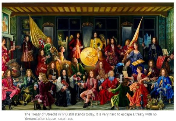 ‘The 1713 Treaty of Utrecht still holds force – to the eternal irritation of Madrid – because it is extremely difficult to abrogate. “You cannot get out treaties unless there is a ‘denunciation clause’ or by mutual agreement,” said Lorand Bartels, a law don at Cambridge.